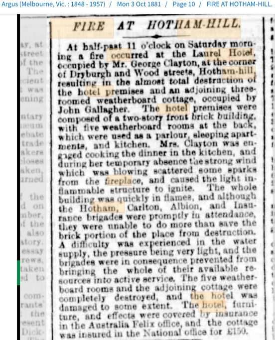 At half-past 11 o’clock on Saturday morning a fire occurred at the Laurel Hotel, occupied by Mr. George Clayton, at the corner of Dryburgh and Wood streets, Hotham-hill, resulting in tho almost total destruction of the hotel premises and an adjoining three roomed weatherboard cottage, occupied by John Gallagher. The hotel premises were composed of a two story front brick building, with five weatherboard rooms at the back, which were used as a parlour, sleeping apartments, and kitchen. Mrs. Clayton was engaged cooking the dinner in the kitchen, and during her temporary absence the strong wind which was blowing scattered some sparks from the fireplace, and caused the light inflammable structure to ignite. The whole building was quickly in flames, and although the Hotham, Carlton, Albion, and Insurance brigades were promptly in attendance, they were unable to do more than save the brick portion of the place from destruction. A difficulty was experienced in the water supply, the pressure being very light, and the brigades were in consequence prevented from bringing the whole of their available resources into active service. The five weather-board rooms and the adjoining cottage were completely destroyed, and the hotel was damaged to some extent. The hotel, furniture, and effects were covered by insurance in the Australia Felix office, and the cottage was insured m the National office for £150.