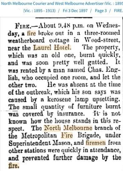 1897. FIRE.-About 1.48 p.m. on Wednesday, a fire broke out in a three-roomed weatherboard cottage in Wood-street, near the Laurel Hotel. The property, which was an old one, burnt quickly, and was soon pretty well gutted. It was rented by a man named Chas. English, who occupied one room, and let the other two. He was absent at the time of the outbreak, which his son says was caused by a kerosene lamp upsetting.
