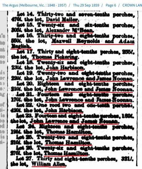 | 1859 | Messrs. John Lawrence and James Noonan, first Crown land purchasers | source: Hatcher Index | ||