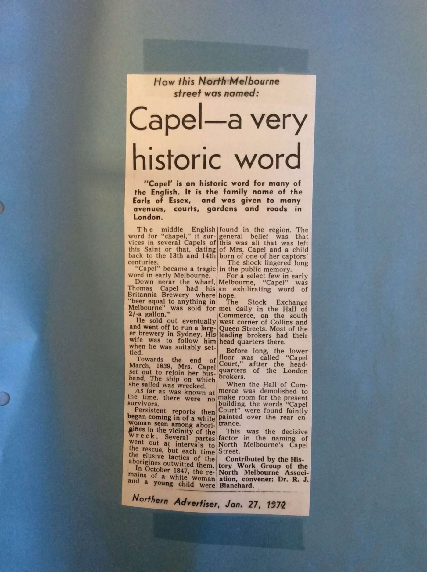 Capel Street begins in West Melbourne where it intersects with William Street before it heads north and ends when it runs into Bedford Street, North Melbourne. It is thought the street was named after Thomas Bladen Capel, a Londoner born in 1776, the son of William Capel and Harriet Bladen. He had a distinguished naval career, fighting for his king in the 1805 Battle of Trafalgar against the French and Spanish during the Napoleonic Wars. Capel Street’s earliest residents began settling in around 1854, six years before the street was officially documented in the government gazette. The area’s first significant landmark, known then as the cattle yard, had begun even earlier, in 1842, on the corner of Elizabeth and Victoria Streets. The street was first mentioned in the Argus in August, 1854, in an advertisement placed by local resident George Holt Miller, a master wheelwright and farrier. He announced his interest in selling two superior Scottish-built Whitechapel two-wheeled spring-carts, then all the rage in London. Miller has his own intriguing story. After arriving in Port Phillip in 1833 as a six-year-old, later in adulthood, he married Sarah Lambert in 1851. After she died during child birth, George married Helen McPherson …